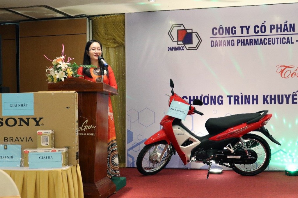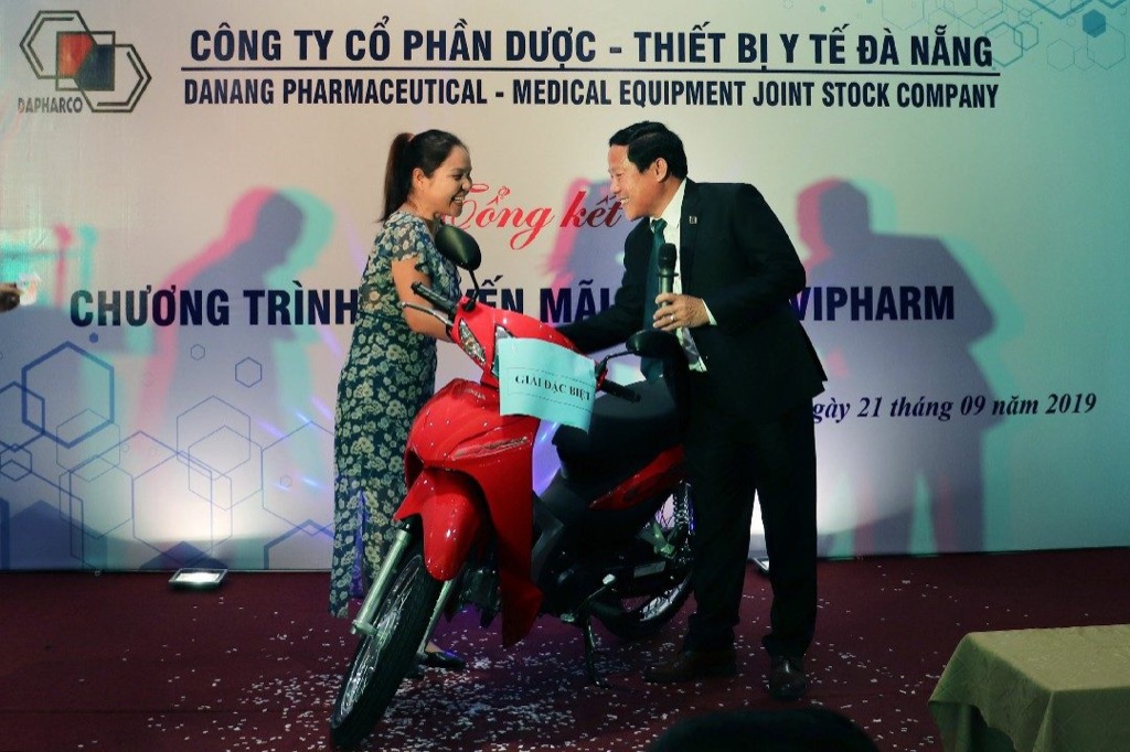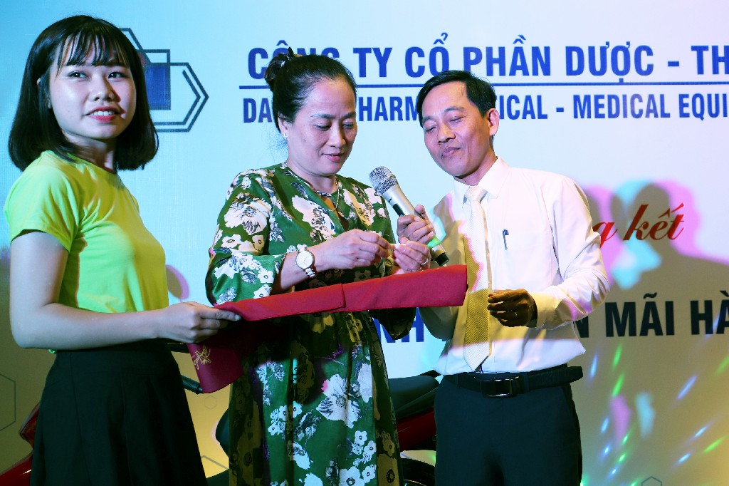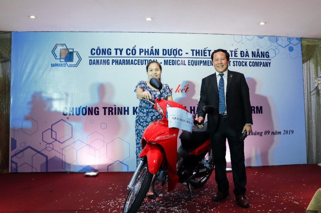 Tổng Giám đốc Tống Viết Phải trao giải đặc biệt Xe Honda Wave Alpha cho Dược sĩ Huỳnh Thị Thọ (Nhà thuốc Dapharco 173) – khách hàng may mắn nhất của buổi hội nghị.