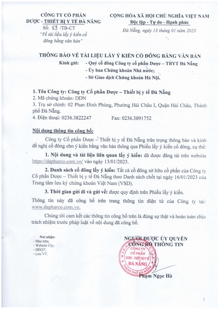 Công ty CP Dược – TBYT Đà Nẵng công bố tài liệu lấy ý kiến cổ đông bằng văn bản.