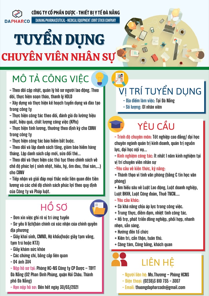 Nhằm đáp ứng nhu cầu phát triển hoạt động của công ty. Công ty Cổ phần Dược – Thiết bị Y tế Đà Nẵng (Dapharco) thông báo tuyển dụng 01 Chuyên Viên Nhân sự làm việc tại Văn phòng công ty. Thông tin chi tiết như sau: