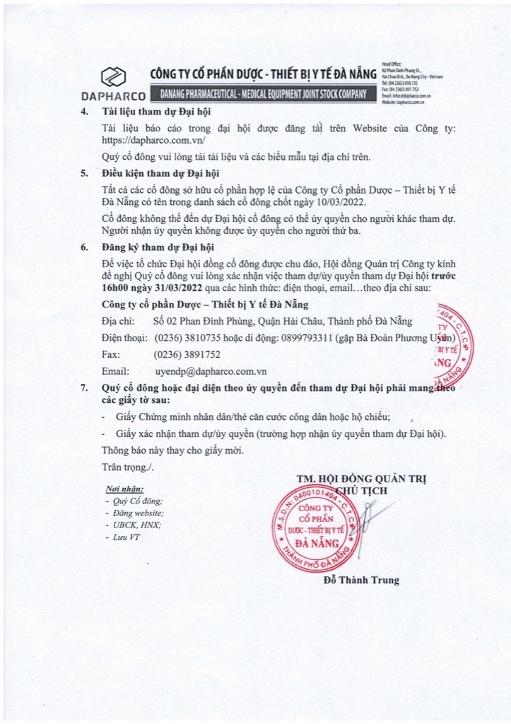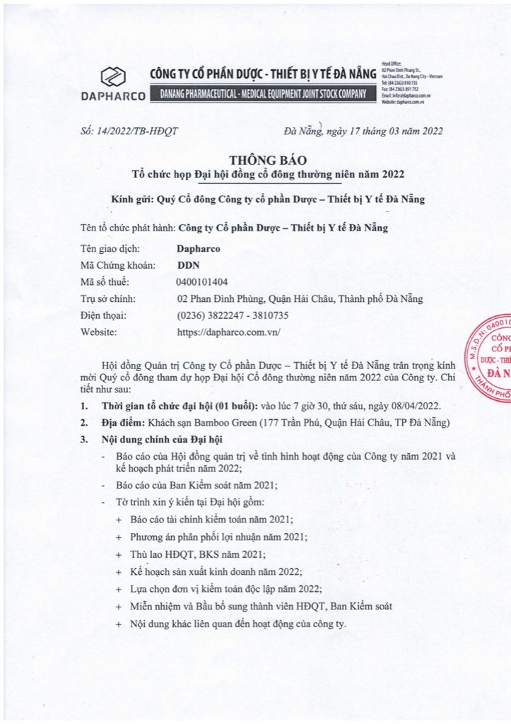 - Thông báo mời họp Đại hội đồng cổ đông thường niên 2022.