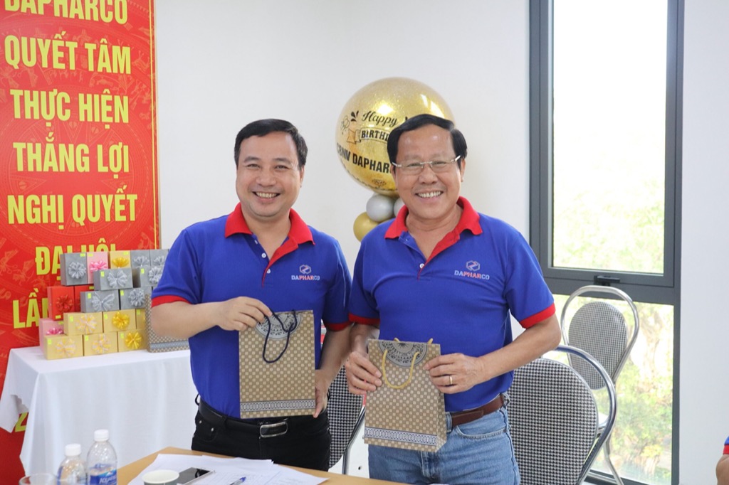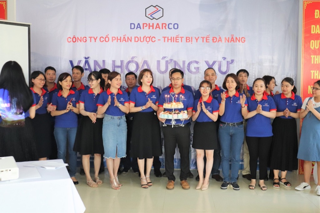 Anh chị em CB CNV Dapharco cùng nhau thổi nến chúc mừng sinh nhật và nhận quà từ ban TGĐ công ty.