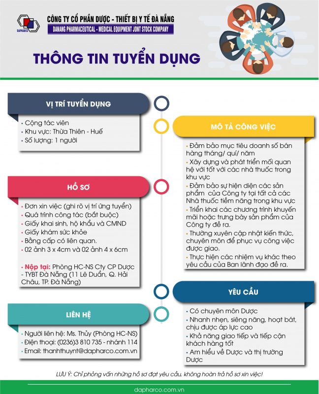 Nhằm đáp ứng nhu cầu phát triển, mở rộng hoạt động kinh doanh, Công ty Cổ phần Dược – Thiết bị Y tế Đà Nẵng (Dapharco) thông báo tuyển dụng Cộng tác viên tại khu vực Thừa Thiên – Huế: