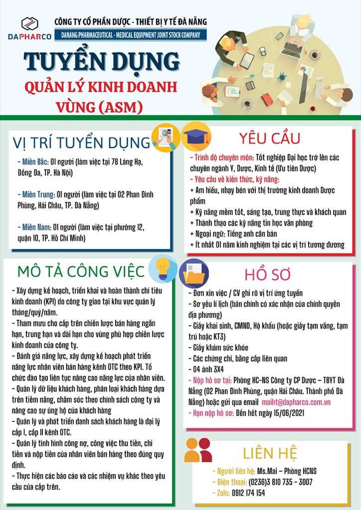 Nhằm đáp ứng theo lộ trình phát triển kinh doanh đa kênh trên toàn quốc của Công ty. Công ty Cổ phần Dược – Thiết bị Y tế Đà Nẵng (Dapharco) thông báo tuyển dụng Vị trí quản lý Kinh doanh vùng tại miền Bắc, miền Trung và miền Nam. Vui lòng xem thông tin chi tiết như sau:
