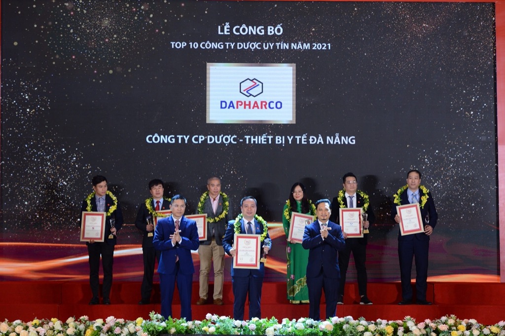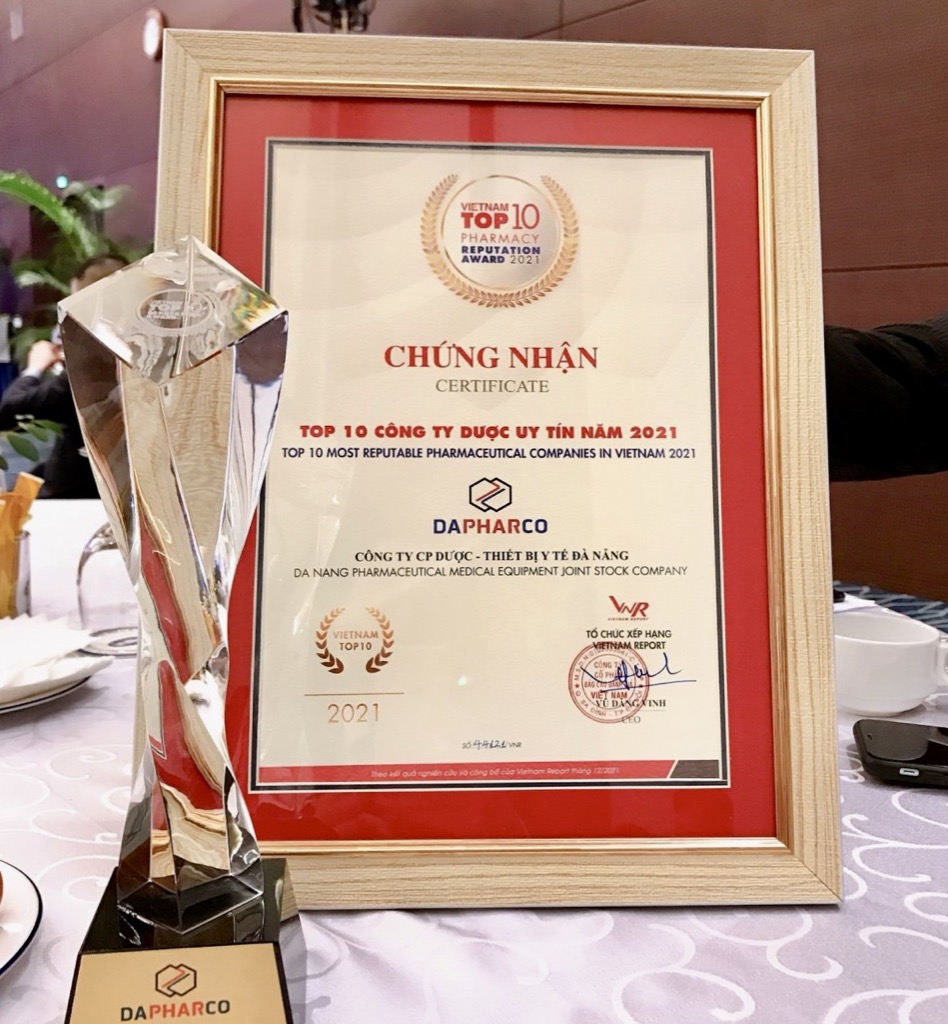 Hôm nay 14/01/2022, Công ty Cổ phần Dược – Thiết bị y tế Đà Nẵng (DAPHARCO) đã vinh dự được trao giải thưởng “ Top 10 công ty Dược Việt Nam Uy tín năm 2021 – nhóm ngành: Phân phối, kinh doanh dược phẩm, trang thiết bị y tế.
