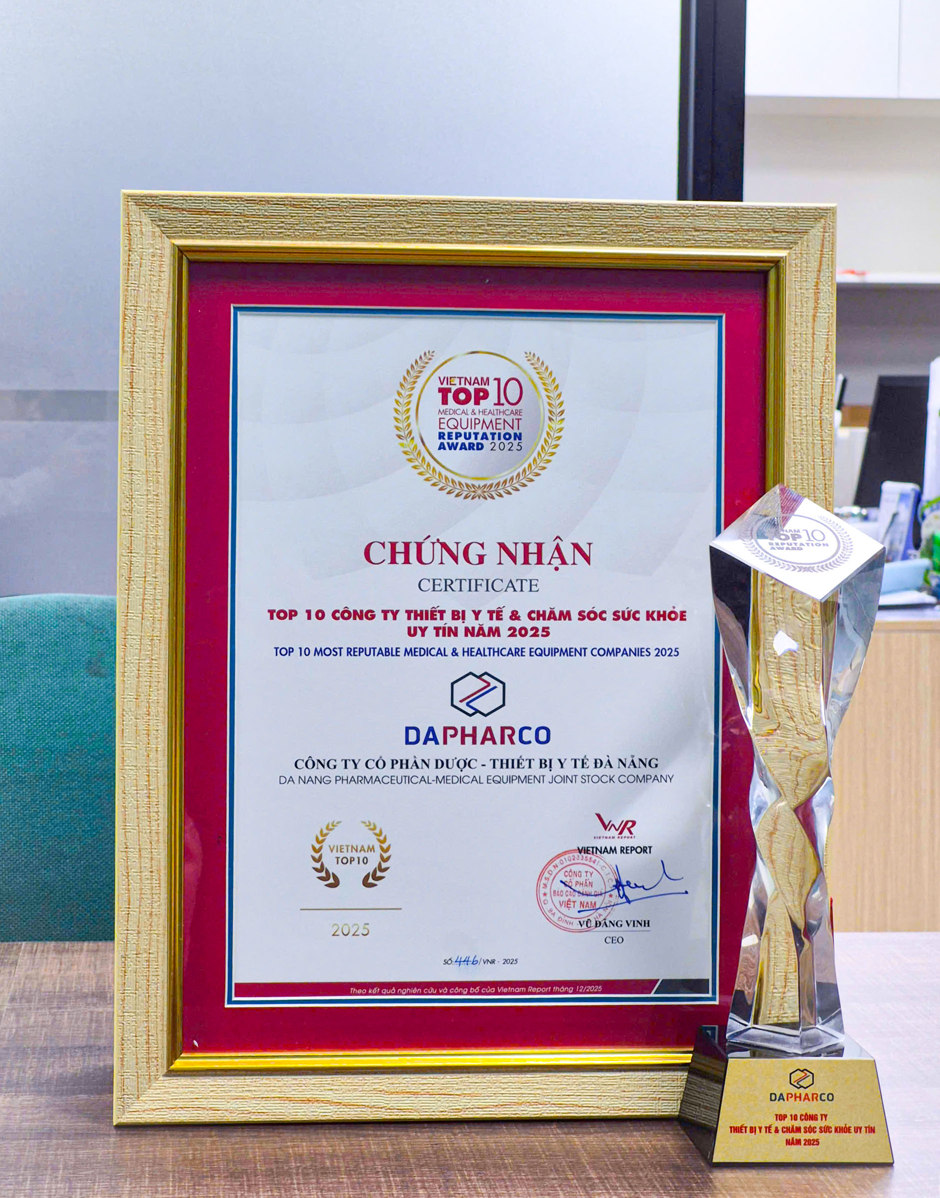 Ngày 08/01/2026, tại Thủ đô Hà Nội, Công ty Cổ phần Dược – Thiết bị Y tế Đà Nẵng (Dapharco) vinh dự được xướng tên trong “Top 10 Công ty Thiết bị Y tế, Chăm sóc Sức khỏe Uy tín năm 2025” do Vietnam Report phối hợp cùng Báo VietNamNet tổ chức.