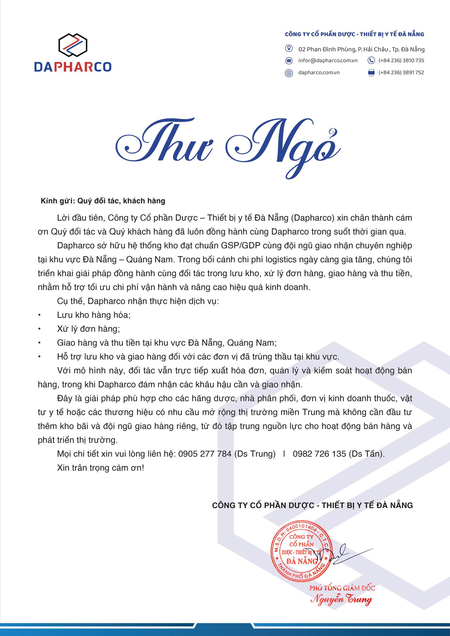 Với hơn 50 năm kinh nghiệm trong lĩnh vực dược phẩm, Công ty Cổ phần Dược – Thiết bị y tế Đà Nẵng (Dapharco) triển khai dịch vụ lưu kho, xử lý đơn hàng, giao hàng và thu tiền dành cho các doanh nghiệp có nhu cầu mở rộng hoạt động kinh doanh tại khu vực miền Trung, đặc biệt là Đà Nẵng và Quảng Nam.