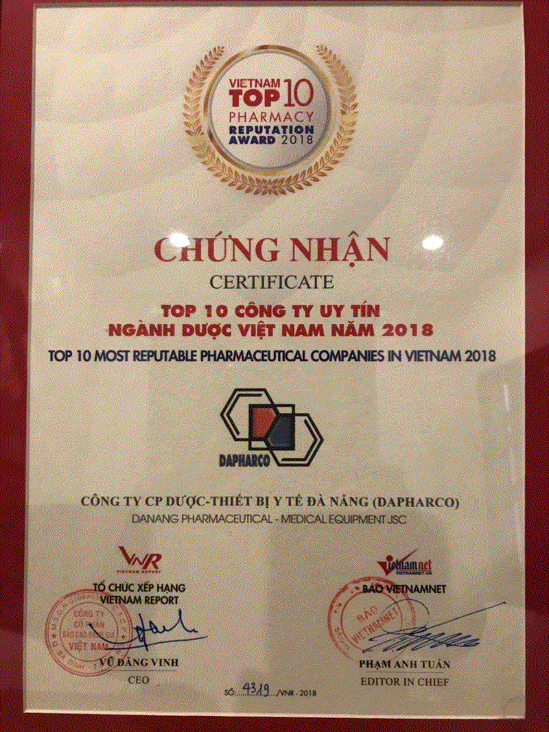 Ngày 26/12/2018, Công ty Cổ phần Báo cáo Đánh giá Việt Nam (Vietnam Report), phối hợp cùng báo điện tử Vietnamnet, công bố Top 10 Công ty Dược uy tín năm 2018.