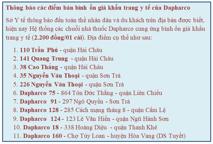Địa chỉ các nhà thuốc thuộc Dapharco tại Đà Nẵng bán khẩu trang bình ổn giá: